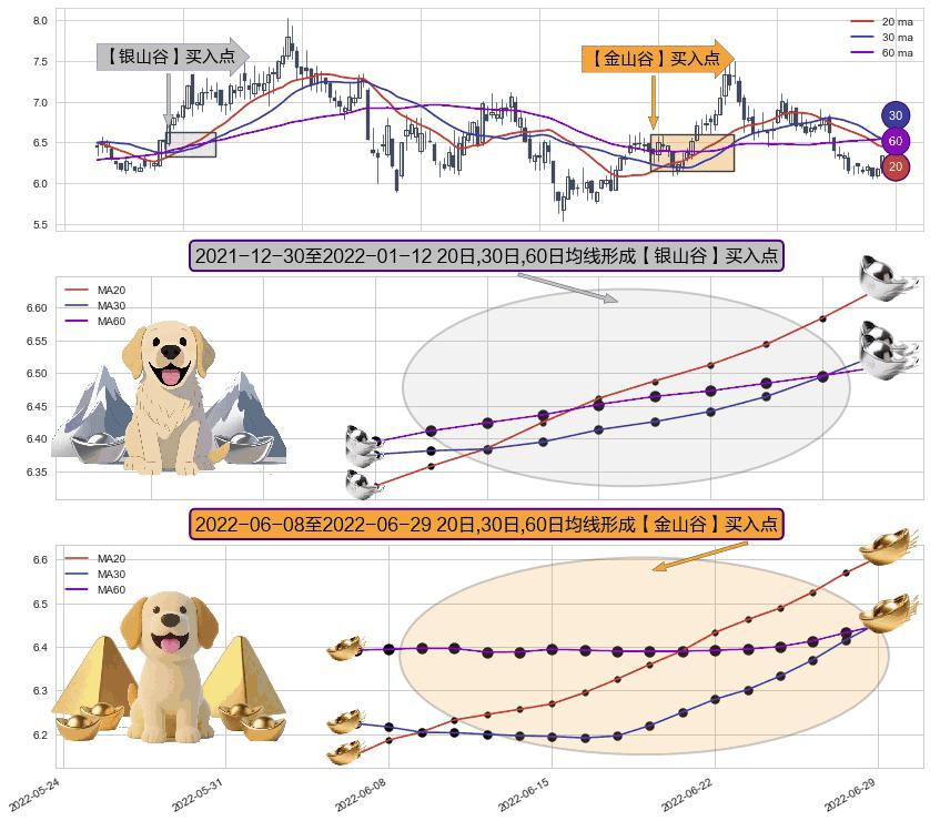⚃ 2022-06-09-日至2022-06-29-日显现 20日-30日-60日均线 【金山谷】买入点 其再次确认了买入信号,可靠性更强,买入