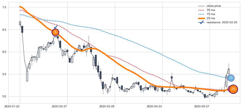 ⚂ 2022-05-25日开盘向上跳空高开+0.17%, 向上脱离整理形态,且收盘突破均线组合