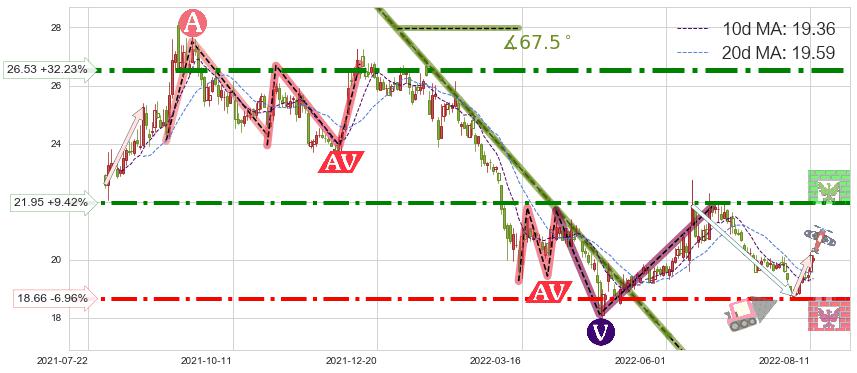 ♘ 阻力价格位21.95,可信任强度73.46%,距离最后交易2022-08-12形成的收盘价格20.06相差 +9.42%