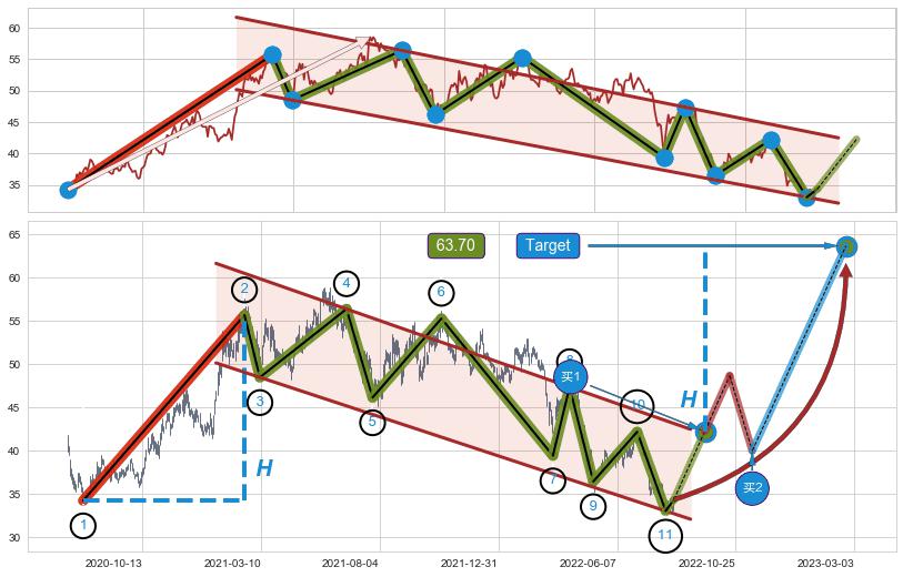 ➣ AI预测: 假定反转启动后, 第❸目标位置(2023-10-09, 58.50)