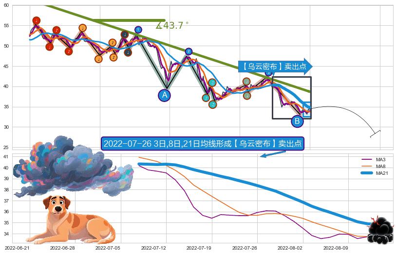 从2021-10-26至2022-08-11,共包含196个交易日,阶段股价下跌-43.16%,阶段股价变动位移路程比: 1 : 6,下跌趋势角度: 43.7