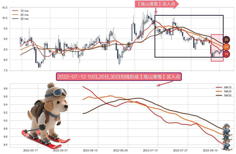 ⚀ 2022-06-08日-2022-08-12日显现 10日-20日-30日均线 【高山滑雪】买入点 看多信号,后市看涨,买入