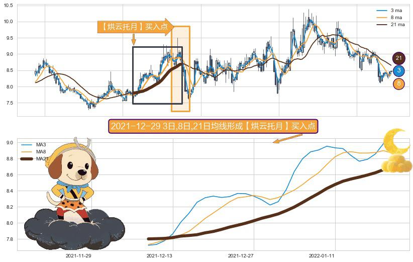 ⚀ 2021-12-08日-2022-01-20日显现 3日-8日-21日均线 【烘云托月】买入点 看多信号,后市看涨,买入