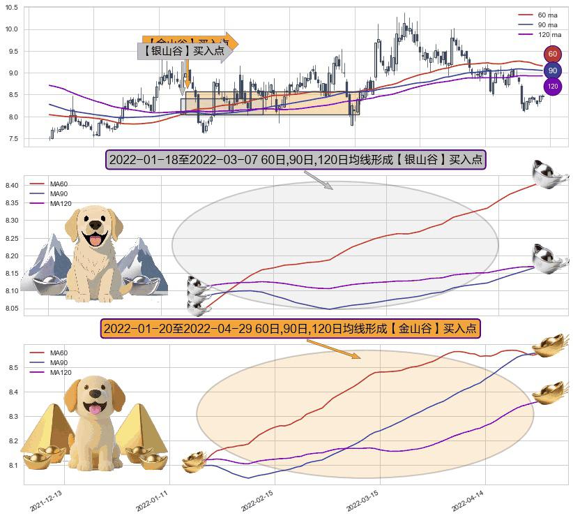 ⚀ 2022-01-21-日至2022-04-29-日显现 60日-90日-120日均线 【金山谷】买入点 其再次确认了买入信号,可靠性更强,买入