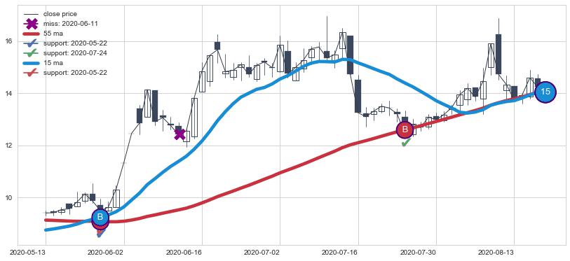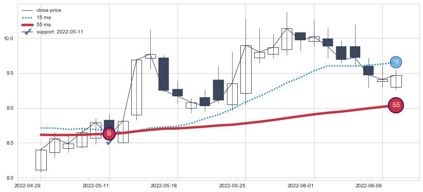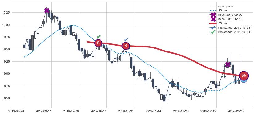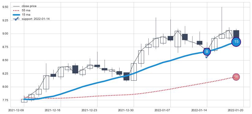 ⚃ 在破位点附近ma走势明显平稳迹象,稍后的走势中ma下垂迹象也出现,信号【可信度中等偏上】