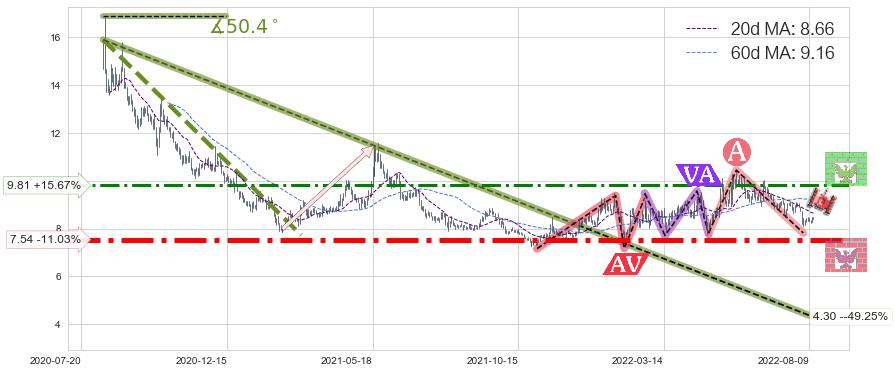 ♘ 支撑价格位7.54,可信任强度97.75%,距离最后交易2022-08-12形成的收盘价格8.48相差 -11.03%