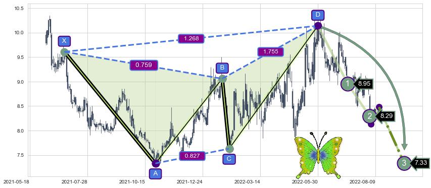 ➣ 已完成【蝴蝶】形态起点X: 2021-06-30, 终点D: 2022-05-30, 共221交易日