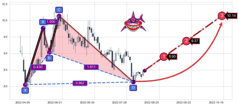 ➣ 已完成【鲨鱼】形态起点X: 2022-04-26, 终点D: 2022-08-03, 共68交易日