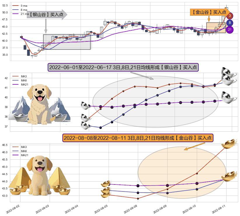⚀ 2022-08-09-日至2022-08-11-日显现 3日-8日-21日均线 【金山谷】买入点 其再次确认了买入信号,可靠性更强,买入