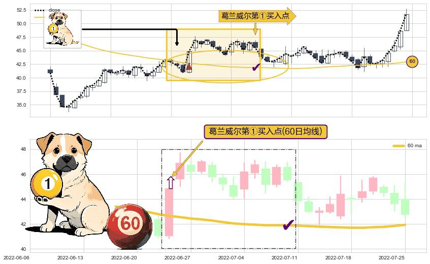 ⚀ 2022-06-23-日显现 葛兰威尔均线 60日均线 第买①入点 走势反转见底信号,后市看涨,买进信号