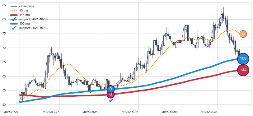 ⚀ 中期均线MA13上穿长期均线MA21形成的交叉是标准 黄金交叉