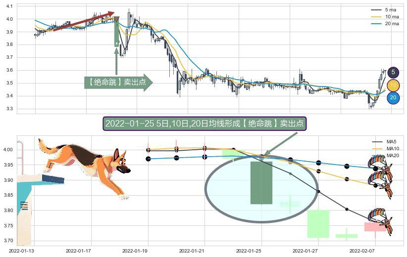 ⚀ 2022-01-25日显现 5日-10日-20日均线 【绝命跳】卖出点 看空信号,后市看跌,卖出