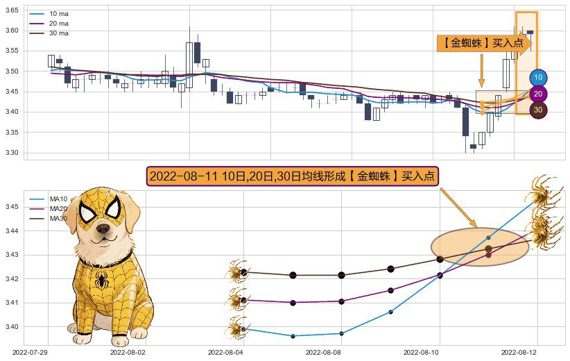 ⚀ 2022-08-11日显现 10日-20日-30日均线 【金蜘蛛】买入点 看多信号,后市看涨,买入