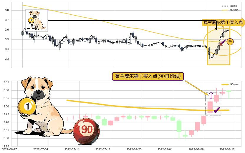 ⚀ 2022-08-09-日显现 葛兰威尔均线 90日均线 第买①入点 走势反转见底信号,后市看涨,买进信号