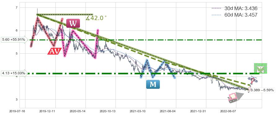 🦴 长线均值回复组合短线趋势跟踪[强阻力信号]2019-09-10-2022-08-10下跌趋势依然成立(下跌趋势跟踪依然存在),短线价格略微上行反弹(均值回复猜想),即将接近下跌趋势提供的未破位阻力价格:3.389。