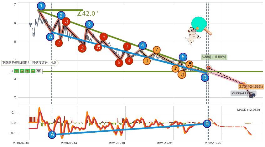 ♘ 在最后的下跌阶段2019-09-10至2022-08-10,存在 破位边缘的阻力位 ,阻力价格3.389,可信任强度84.13%,其距离最后价格3.590相差 -5.59%