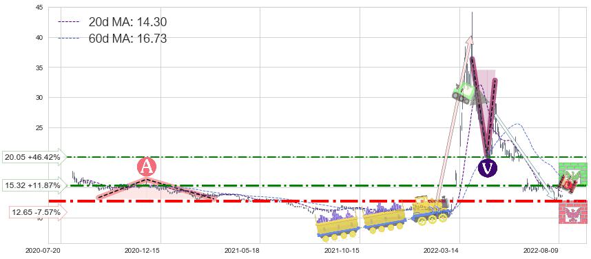♘ 阻力价格位20.05,可信任强度40.09%,距离最后交易2022-08-12形成的收盘价格13.69相差 +46.42%