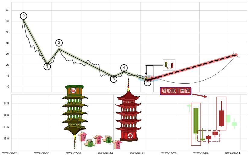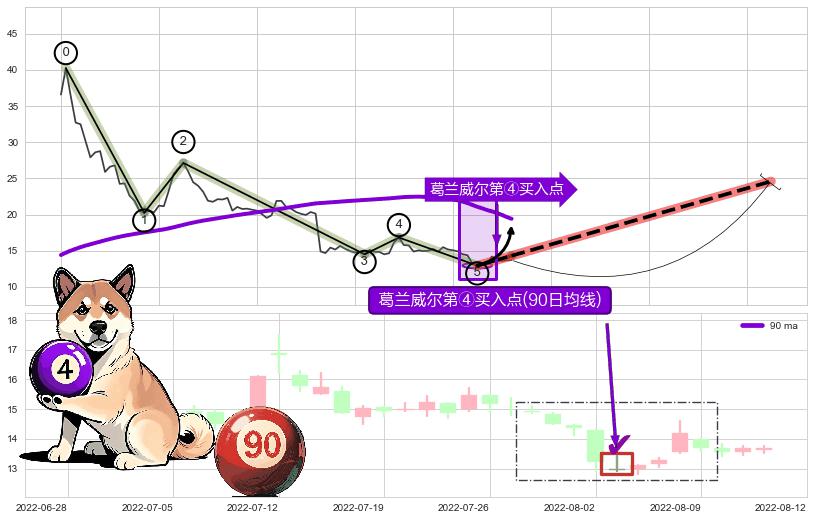 ➢ 低点影线(2022-08-10: 13.42 )→回踩→第二根k线低点(2022-08-08: 13.53 )