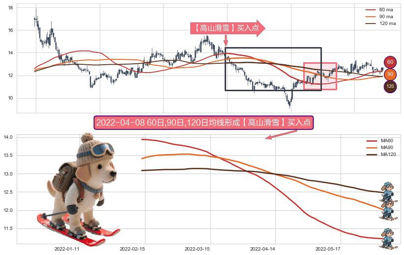 ⚀ 2022-02-14日-2022-06-06日显现 60日-90日-120日均线 【高山滑雪】买入点 看多信号,后市看涨,买入