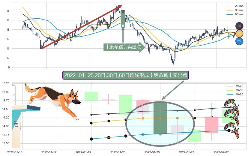 ⚀ 2022-01-25日显现 20日-30日-60日均线 【绝命跳】卖出点 看空信号,后市看跌,卖出