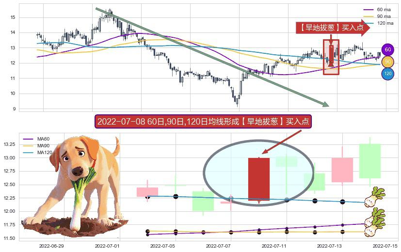 ⚀ 2022-07-08日显现 60日-90日-120日均线 【旱地拔葱】买入点 看多信号,后市看涨,买入