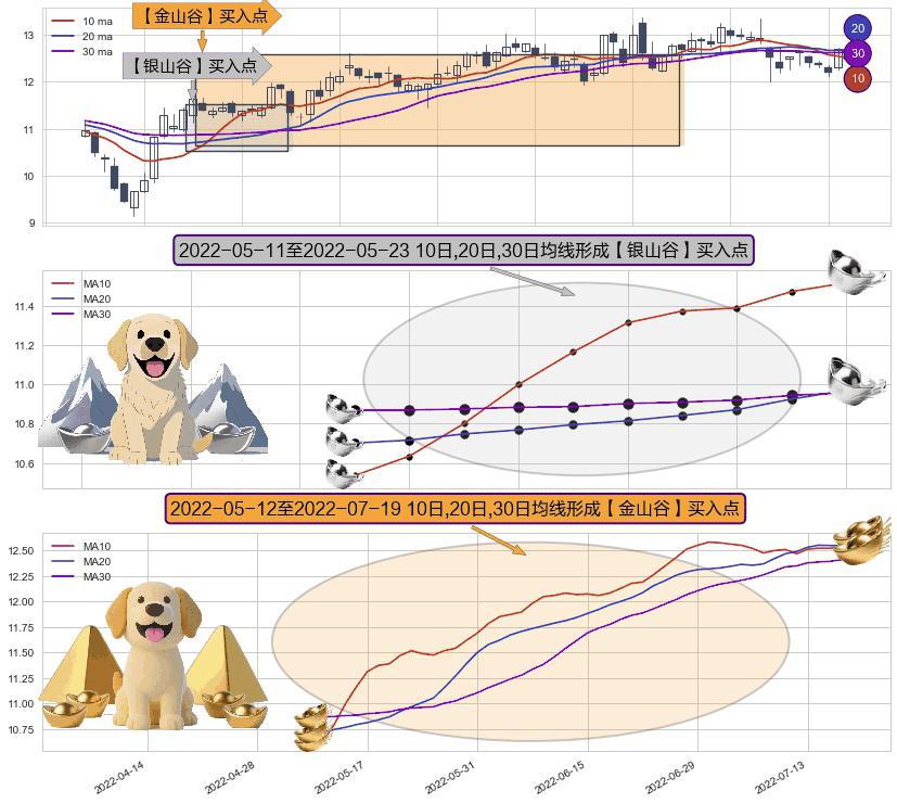 ⚀ 2022-05-13-日至2022-07-19-日显现 10日-20日-30日均线 【金山谷】买入点 其再次确认了买入信号,可靠性更强,买入