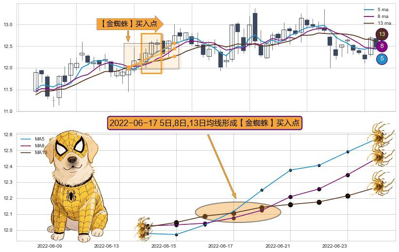 ⚀ 2022-06-17日显现 5日-8日-13日均线 【金蜘蛛】买入点 看多信号,后市看涨,买入