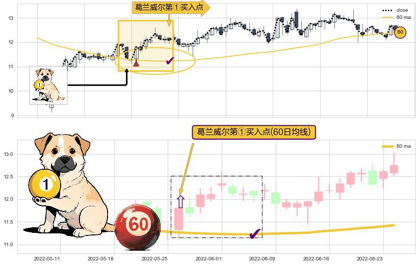 ⚀ 2022-05-26-日显现 葛兰威尔均线 60日均线 第买①入点 走势反转见底信号,后市看涨,买进信号