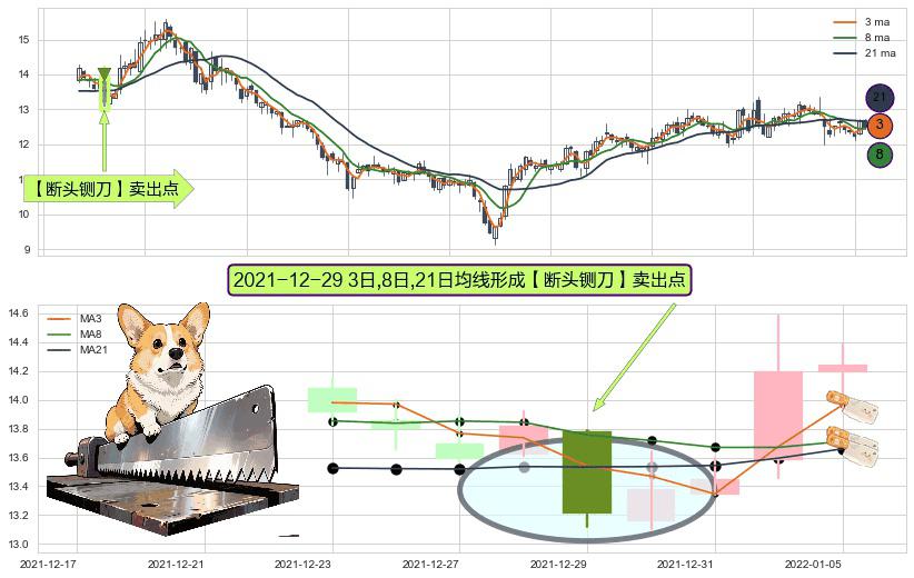 ⚀ 2021-12-29日显现 3日-8日-21日均线 【断头铡刀】卖出点 看空信号,后市看跌,卖出
