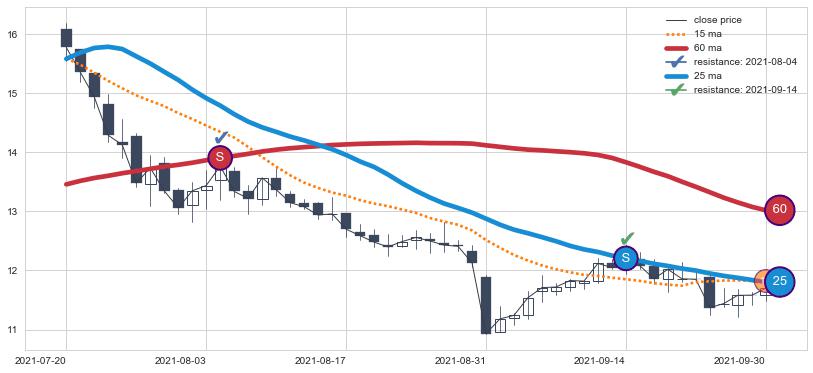 ➢ 最优均线组合共正确确认支撑阻力信号9处,正确确认率 69.23%
