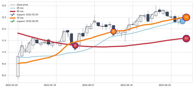 ⚂ 2022-07-08日开盘向上跳空高开+0.16%, 向上脱离整理形态,且收盘突破均线组合