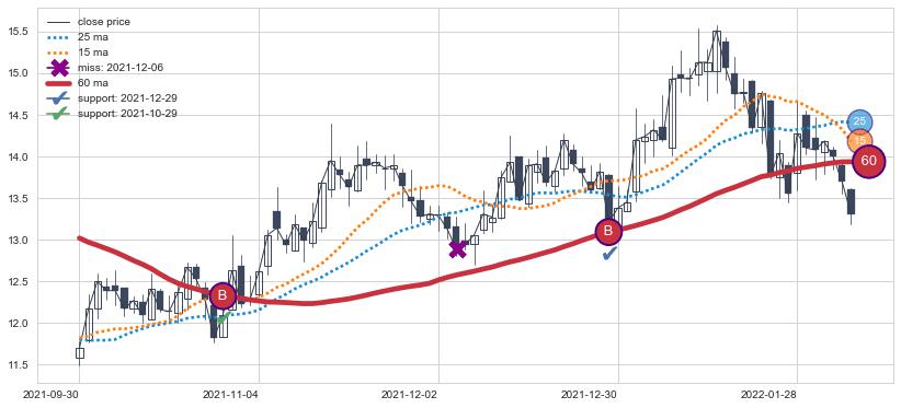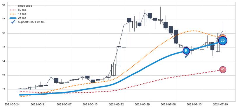 ⚁ MA3和MA8走势平行,且始终保持在短距离内,MA21始终在短中期均线下方,与短中期均线保持一定的距离,微微上行