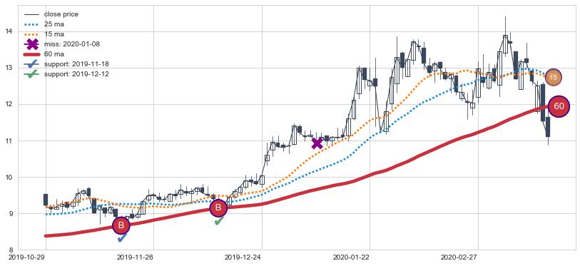 ⚅ 买点向上突破均线后,价格走势很纠结,不断在均线周围试探,有再次下探破位均线的可能