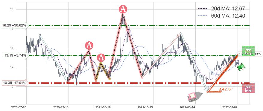 ♘ 阻力价格位13.19,可信任强度47.93%,距离最后交易2022-08-12形成的收盘价格12.47相差 +5.74%