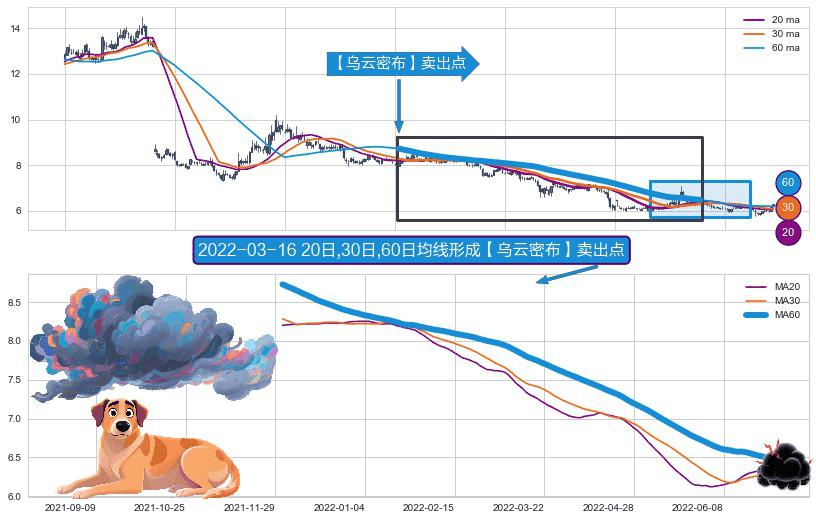 ⚀ 2021-12-01日-2022-06-28日显现 20日-30日-60日均线 【乌云密布】卖出点 看空信号,后市看跌,卖出