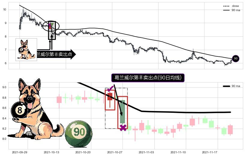 ⚀ 2021-10-27-日显现 葛兰威尔均线 90日均线 第⑧卖出点 下降趋势的中继信号,后市看跌,卖出信号