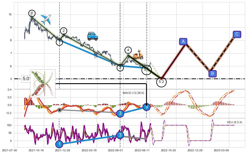 ➣ 5.1: 预测当前第5浪位置(2022-08-03, 5.85),仍然有下跌空间