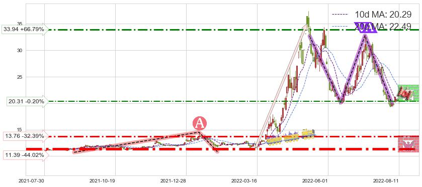 ♘ 支撑价格位13.76,可信任强度59.55%,距离最后交易2022-08-12形成的收盘价格20.35相差 -32.39%