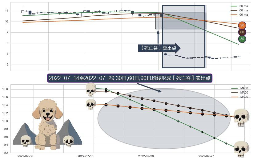 形态多维评估: ⚀ 2022-07-15-日至2022-07-29-日显现 30日-60日-90日均线 【死亡谷】卖出点 看空信号,后市看跌,卖出
