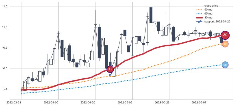 上涨趋势2022-03-21-2022-06-13,均线30确认关键支撑1处