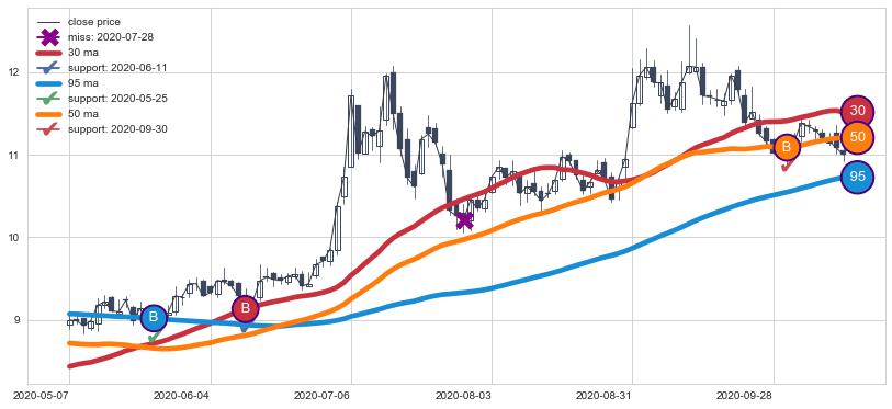 上涨趋势2020-05-07-2020-10-20,均线50, 30, 95确认关键支撑3处
