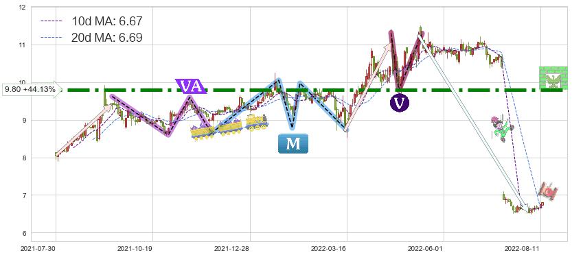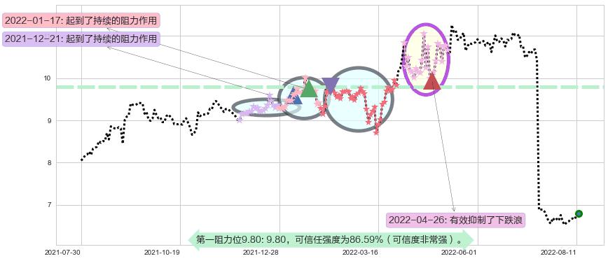 ♘ 阻力价格位9.80,可信任强度86.59%,距离最后交易2022-08-12形成的收盘价格6.80相差 +44.13%