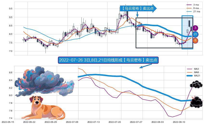 ⚀ 2022-07-06日-2022-08-12日显现 3日-8日-21日均线 【乌云密布】卖出点 看空信号,后市看跌,卖出