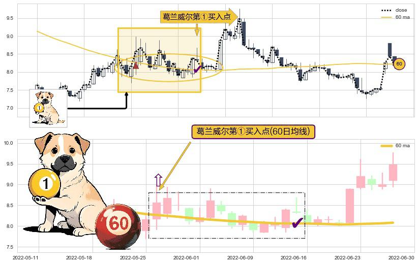 ⚀ 2022-05-26-日显现 葛兰威尔均线 60日均线 第买①入点 走势反转见底信号,后市看涨,买进信号