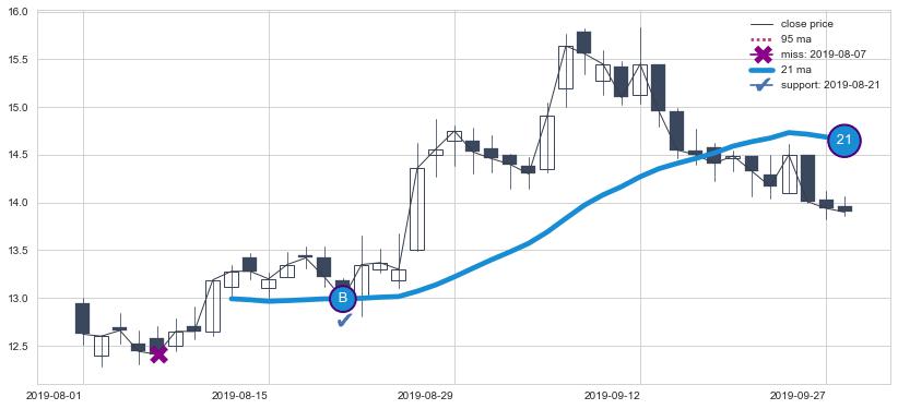 ⚁ MA3和MA8走势平行,且始终保持在短距离内,MA21始终在短中期均线上方,与短中期均线保持一定的距离,微微下行