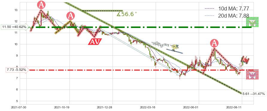 ♘ 支撑价格位7.73,可信任强度57.73%,距离最后交易2022-08-12形成的收盘价格8.18相差 -5.52%