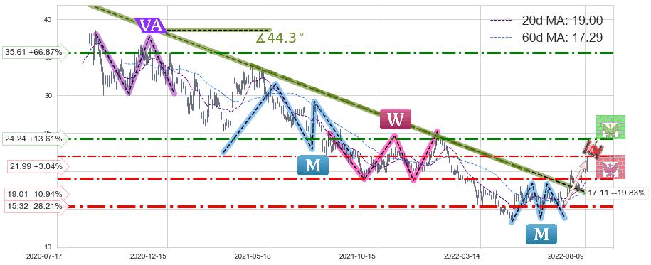 ➣ 2020-08-21-2022-05-20下跌趋势存在反转上涨[机会],其原下跌趋势的阻力位(17.11)已被突破[强支撑信号],原下跌趋势角度: 44.3˚