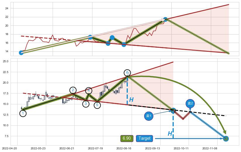 ➢ 最小反转跌幅→𝐇: 6.60 (逐步抬高阻力斜边最后的阻力点⑥与支撑边垂直距离)