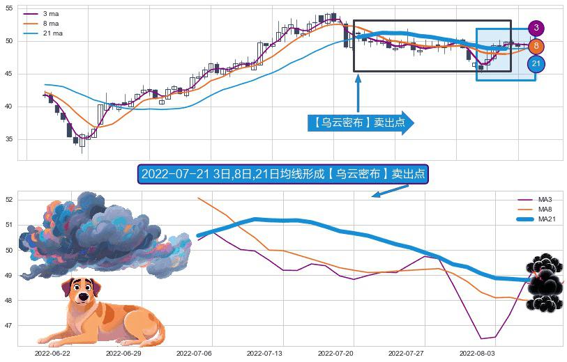 ⚀ 2022-07-05日-2022-08-08日显现 3日-8日-21日均线 【乌云密布】卖出点 看空信号,后市看跌,卖出