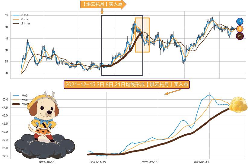 ⚀ 2021-11-04日-2022-01-25日显现 3日-8日-21日均线 【烘云托月】买入点 看多信号,后市看涨,买入